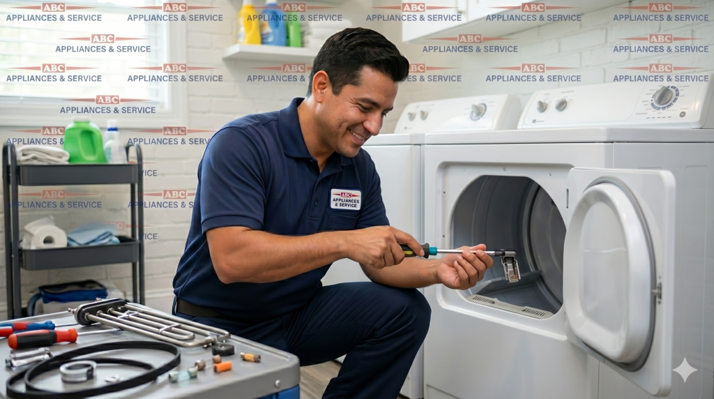 If you are searching for appliance repair near me because your dryer is leaving your clothes wet or making a scary noise, ABC Appliances & Service is here to help. We know that a broken dryer is a huge problem for any home. Nobody wants to have wet clothes hanging all over the house or spend hours waiting for things to dry. Whether your dryer is not heating up, taking too long to dry, or simply won’t turn on, our expert team comes directly to your home in Tampa to fix it fast. We specialize in on-site repairs for all major brands, making sure your dryer runs like new again so you can get back to your normal routine.